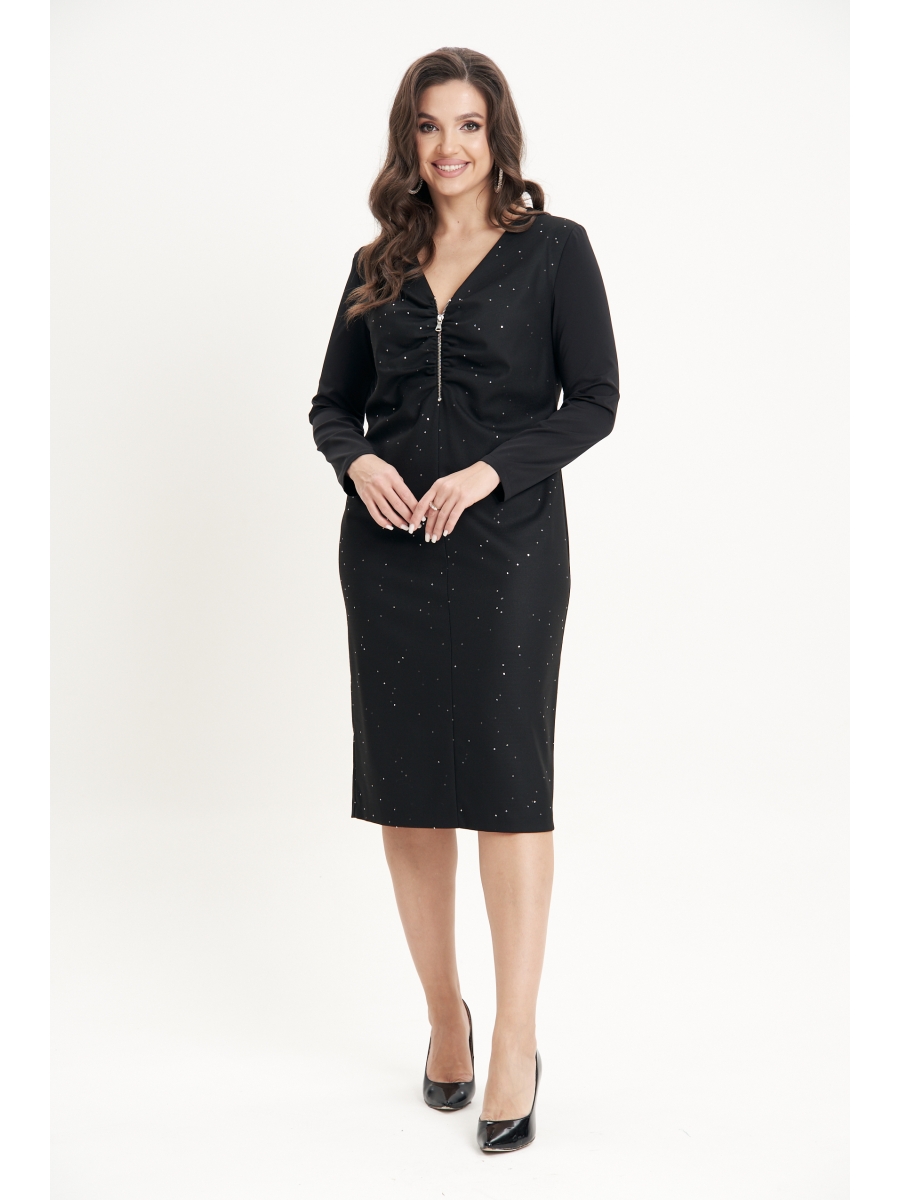 Это платье - беспроигрышный вариант на все случаи жизни - ""надень на себя блестящее""! Черное платье с легким вкраплением пайетки - блистать, так уверенно! Трендовая модель длины чуть ниже колена, полуприлегающий силуэт, втачной покрой. Полочка с центральным швом, застежкой молнией и эффектной драпировкой. Спинка с центральным швом и шлицей. Рукав из отделочной атласной ткани.