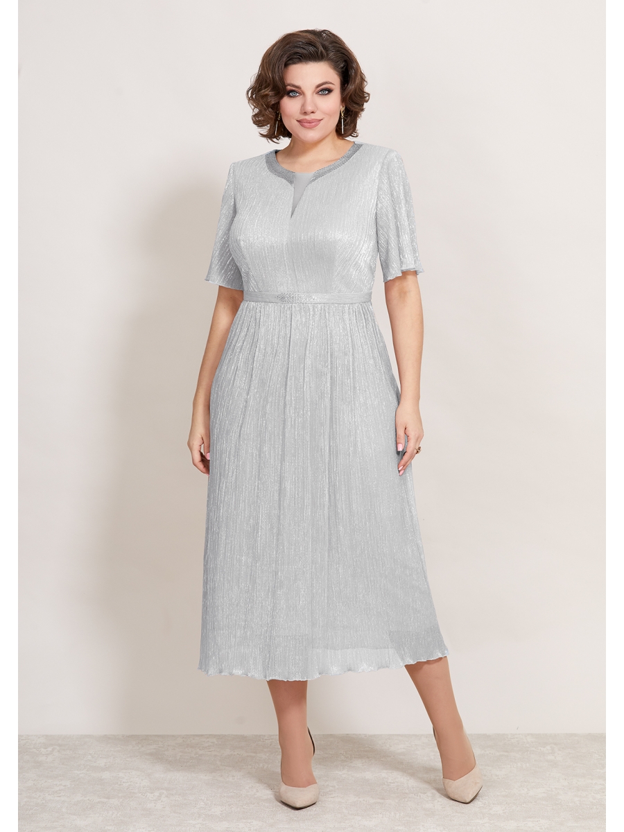 Эффектное женское платье, полу-прилегающего силуэта, выполнено из плиссированной ткани, на трикотажной подкладке. Лиф платья отрезной по линии талии, горловина округлой формы, на обтачке, также на горловине обработаны втачные планки из атласа в тон и декорированы стразами. По линии горловины выполнена вставка из сетки, что придает платье еще больше эффектности, по линии талии втачной пояс из основной ткани, декорирован стразами. Юбка присборена по линии талии и расклешена к низу, спинка отрезная по линии талии, со средним швом и вытачками. Рукав втачной, выполнен з основной ткани, укороченный. Стильное платье, то, что надо для торжественного мероприятия!