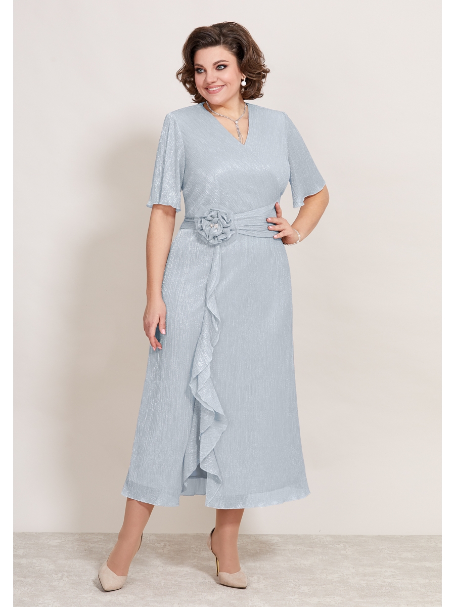 Нарядное женское платье полу-прилегающего силуэта, выполнено из плиссированной ткани, на трикотажной подкладке. Горловина V-образной формы, на обтачке, лиф платья отрезной по линии талии, с втачным поясом из основной ткани, декорирован съемным цветком. Юбка А-образного силуэта, на юбке выполнен вертикальный подрез, с разрезом по низу и вставками воланов из основной ткани. Спинка со средним швом и вытачками, рукав втачной, оптимальной длины, выполнен из основной ткани.