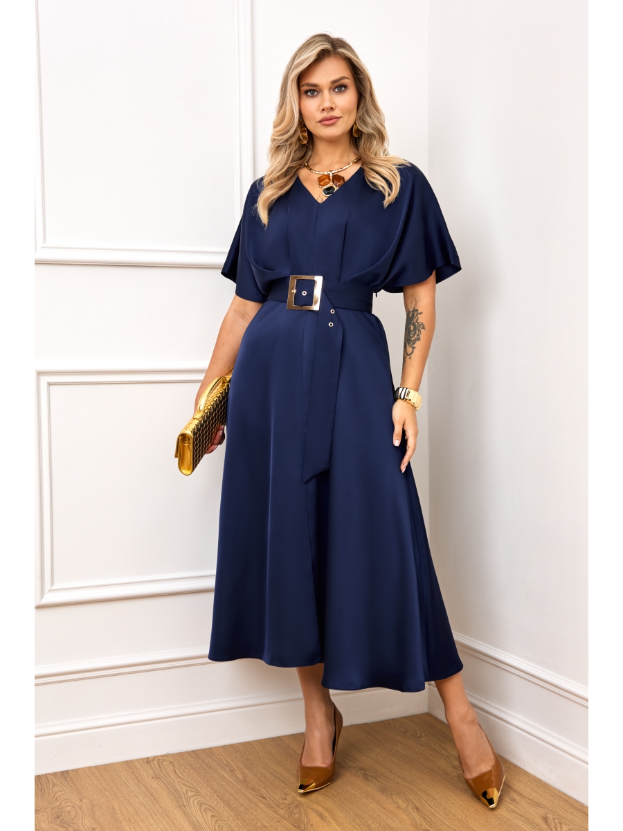 Элегантное нарядное платье, выполнено из роскошной струящейся плательной ткани с добавлением вискозы. Платье с V-образным вырезом горловины, отрезное по линии талии. Верхняя часть платья выполнена в свободном стиле со спущенной линией плеча и глубокими складками на линии талии, что придает платью особый стиль и шарм. Юбка платья с расклишением, по переду с разрезом. В боковом шве платья потайная молния застежка. Рукав цельнокроеный, объёмный, со спущенной линией плеча. В комплекте к платью идет съемный пояс с шикарной золотой пряжкой.
