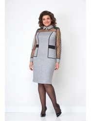 Нарядное платье из приятной трикотажной к телу ткани, полу-приталенного силуэта, по переду полочки. Отделкой служит бархатная тесьма. Кокетка по передней части, полочки из гипюровой ткани. Без талиевых выточек. По горловине потойная молния. Воротник рубашечного типа. Декоративным украшением служит брошь. Рукав длинный, с манжетой из основной ткани.