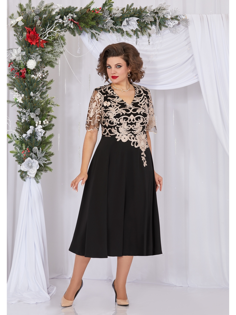 Эффектное женское платье полу-прилегающего силуэта, выполнено из текстиля и кружева. Лиф платья выполнен из кружева с подкладкой из атласа, с V-образным вырезом, отрезной по линии талии, лиф с рельефами, по талии аппликация из кружева. Юбка расклешенного силуэта, выполнена из текстиля, с разрезом по переду. Рукав платья втачной, укороченный из кружева. Спинка идентична полочке, отрезная по линии талии, лиф из кружева, на подкладке из атласа, со средним швом, в среднем шве потайная молния.