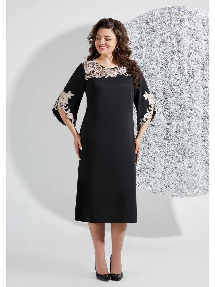 Женское платье полу-прилегающего силуэта, выполнено из текстиля и кружева. На полочке обработана кокетка из кружева, горловина округлой формы, окантована, шов притачивания кокетки декорирован аппликацией. Полочка расклешенная к низу, с нагрудными вытачками, выполнена из текстиля. Рукав втачной из текстиля, оптимальной длины, расклешенный к низу и декорирован аппликацией из кружева. Спинка выполнена из текстиля, со средним швом и вытачками, в среднем шве потайная молния. Элегантное платье утонченно подчеркнет ваш образ!