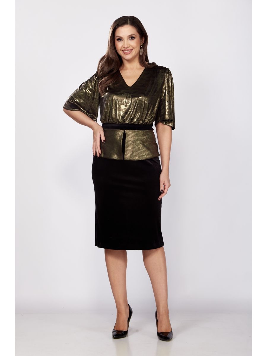 Элегантное, женское платье, полу-прилегающего силуэта, выполнено из трикотажного полотна с принтом и велюра. Лиф платья отрезной по линии талии, с втачным поясом из велюра, горловина V-образной формы, на обтачке. Лиф также присборен по плечам и по линии притачивания пояса, также от пояса вниз обработана отлетная баска из принтованного трикотажного полотна. Спинка идентична полочке, с втачным поясом по линии талии и баской. На спинке, по горловине обработана обтачка, в среднем шве потайная молния, юбка платья из велюра. Рукав втачной, оптимальной длины и присборен по окату. Элегантное платье из эффектной ткани отличный выбор для ярких женщин!