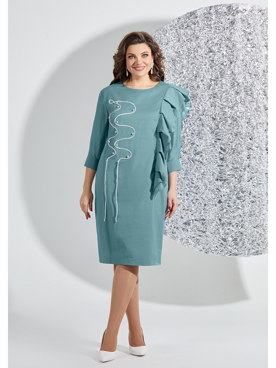 Женское платье свободного покроя, выполнено из хлопковой ткани и ткани-компаньона в горох. Горловина платья округлой формы, на обтачке, по переду выполнены нагрудные вытачки, ассиметричный подрез с вставками воланов из отделочной ткани в горох. По одной стороне переднего полотнища выполнена аппликация из настроченного декоративного шнура и бусин. Спинка платья из однотона, со средним швом и вытачками, в среднем шве потайная молния. Рукав втачной, оптимальной длины, выполнен из отделочной ткани, по низу складки на манжет с застежкой на пуговицы. Стильное платье выполненное из натуральной ткани с трендовой отделкой и модной в этом сезоне асимметрией, отлично дополнит ваш образ!