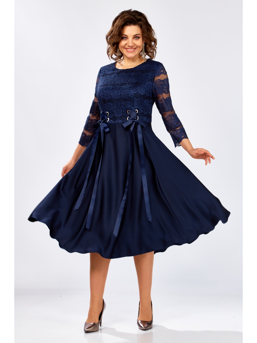 Нарядное женское платье полу-прилегающего силуэта, выполнено из гипюра с глитером и атласа. Лиф платья отрезной по линии талии, выполнен из гипюра с глитером. Горловина платья округлой формы, на обтачке, на полочке выполнены рельефы, по рельефам обработаны люверсы с декоративной лентой. Юбка платья расклешенного силуэта, из атласа, спинка идентична полочке, со средним швом и рельефами, в среднем шве потайная молния. Рукав втачной, оптимальной длины, выполнен из гипюра с глитером.