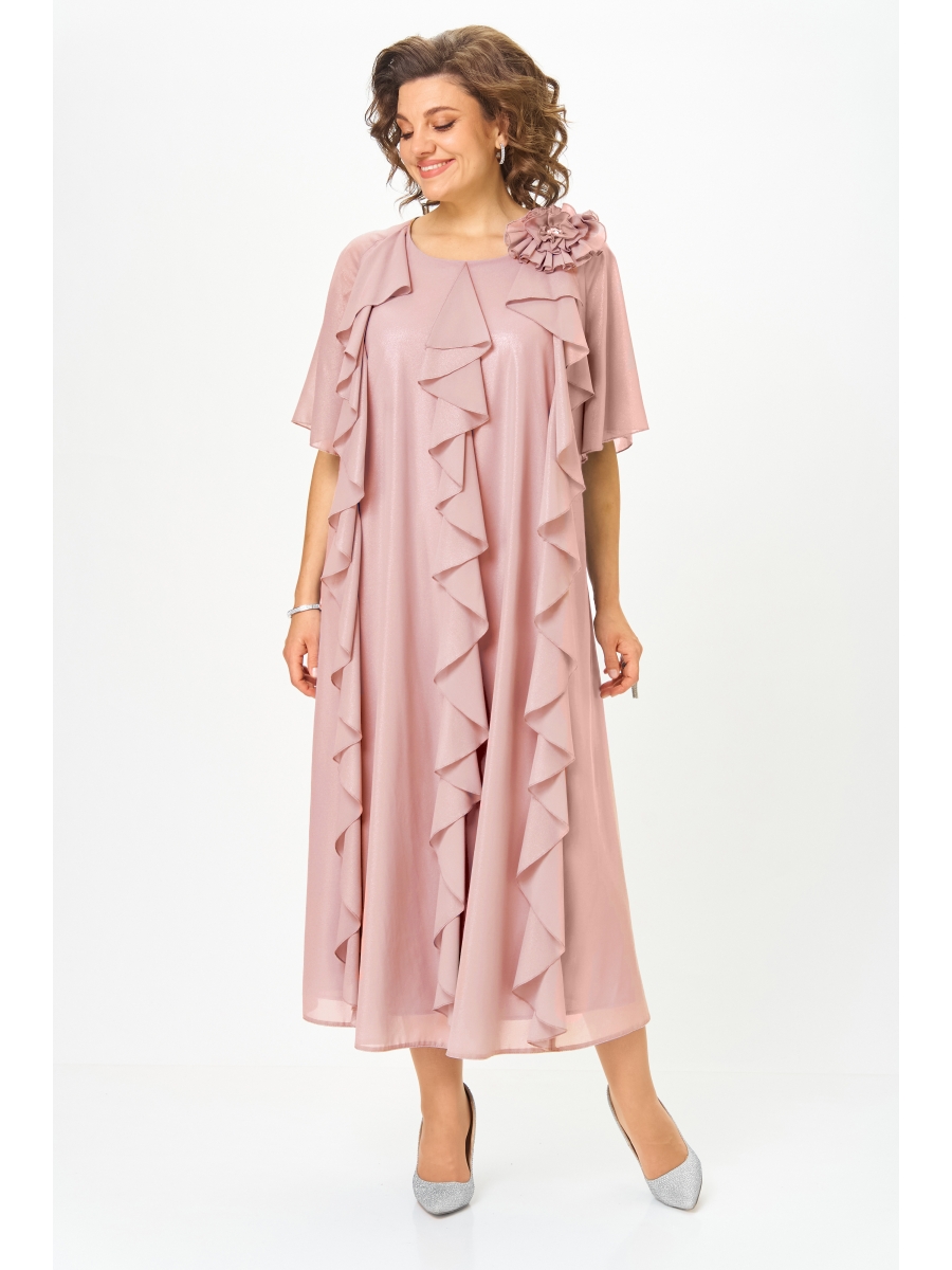 Эффектное платье для обладательниц роскошных форм, свободного покроя, выполнено из шифона, на трикотажной подкладке. Горловина платья округлой формы, на обтачке, на переднем полотнище выполнены вертикальные подрезы с воланами. Спинка со средним швом, рукав покроя реглан, расклешенного покроя, по горловине декор в виде съемного цветка. Легкое, нарядное платье отличный вариант для любительниц комфортных и изящных нарядов!