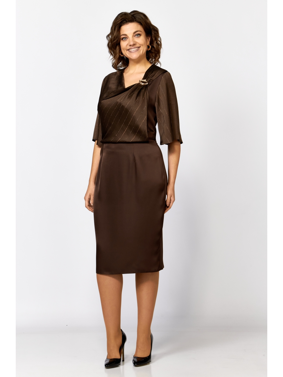 Женское платье полу-прилегающего силуэта, выполнено из однотонного атласа и атласа в полоску. Лиф платья двойной и отрезной по линии талии, горловина нижнего слоя лифа округлой формы, второй слой лифа на полочке выполнен из атласа в полоску и по горловине задрапирован на эффектную пряжку. Юбка платья заужена к низу, с вытачками, выполнена из однотонного атласа. Спинка платья из однотонного атласа, со средним швом и вытачками, в среднем шве потайная молния, по низу разрез. Рукав укороченный, втачной, из атласа в полоску.