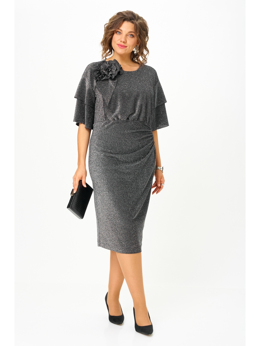 Элегантное, женское платье прилегающего силуэта, выполнено из трикотажного полотна с люрексом. Лиф платья отрезной по линии талии, горловина округлой формы, на обтачке. На лифе выполнена сборка по линии талии, по горловине декор в виде цветка из основной ткани. Юбка платья прямого покроя, по одной стороне втачной бочок со сборкой. Рукав втачной, укороченный и расклешенный к низу, состоит из двух воланов. Спинка идентична полочке, со средним швом и вытачками, отрезное по линии талии. Нарядное платье отлично подойдет для любого мероприятия.