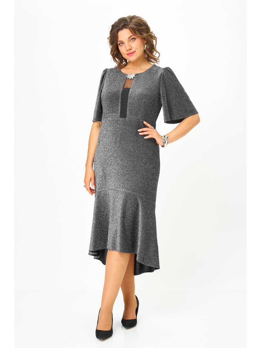 Элегантное, женское платье прилегающего силуэта, выполнено из трикотажного полотна с люрексом. Лиф платья отрезной по линии талии, горловина округлой формы, окантована. На лифе выполнена вставка из сетки с подложкой из основной ткани, по горловине декор в виде цветка из страз. Юбка платья, расклешенного силуэта, с воланом по низу. Рукав втачной, укороченный и расклешенный к низу, по окату присборен. Спинка со средним швом и вытачками, по низу волан. Нарядное платье отлично подойдет для любого мероприятия.