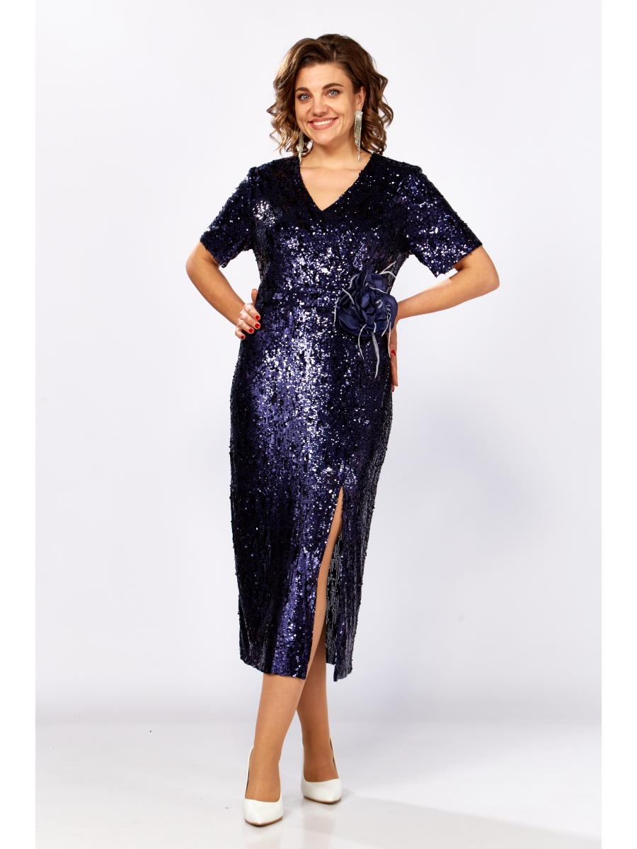 Нарядное платье, полу-прилегающего силуэта, выполнено из ткани в пайетки, на трикотажной подкладке. Лиф платья отрезной по линии талии, пояс втачной, горловина V-образной формы, обтачена подкладкой. Юбка платья прямого покроя, с разрезом по одной стороне. Спинка из пайеток, рукав втачной, укороченный, из пайеток, по линии талии на полочке декор в виде съемного цветка ручной работы.