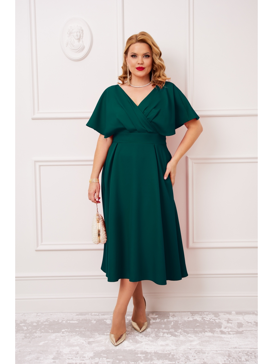 Элегантное нарядное платье, выполнено из роскошной струящейся плательной ткани с добавлением вискозы. Платье с V-образным вырезом горловины, отрезное по линии талии. Верхняя часть платья выполнена в свободном стиле со спущенной линией плеча и глубокими складками на линии талии, что придает платью особый стиль и шарм. Юбка платья с расклишением, по переду с разрезом. В боковом шве платья потайная молния застежка. Рукав цельнокроеный, объёмный, со спущенной линией плеча. В комплекте к платью идет съемный пояс с шикарной пряжкой. Модель удобная и практичная, вы будете в нем выглядеть неотразимо и роскошно.