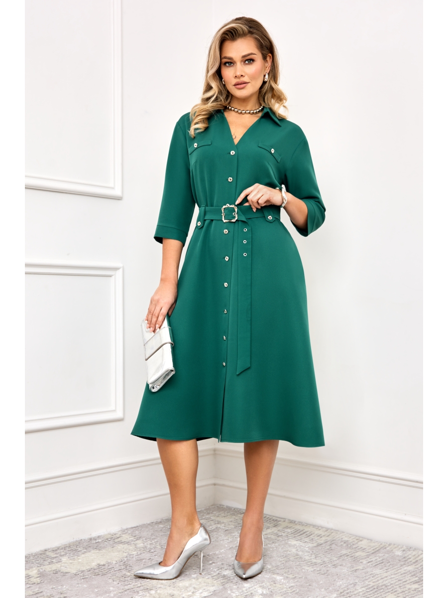 Элегантное женское платье, выполнено из роскошной плательной ткани Барби с напылением. Платье А-силуэта, отрезное по линии талии. Платье по переду с застежкой на пуговицы, в боковых швах юбки функциональные карманы. Рукав втачной, слегка спущенный, по низу с манжетой. По талии пояс из основной ткани, с застежкой на металлическую пряжку. По груди пришита листочка, декорирована пришивной пуговицей.