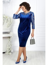 Платье женское, полуприлегающего силуэта, выполнено из бархата в сочетании с гипюром. Нижняя часть переда и спинки на трикотажной подкладке Длина платья по среднему шву спинки 101 см. Перед с притачной фигурной кокеткой, с нагрудными вытачками, идущими из пройм. Спинка с талиевыми вытачками и со средним швом, в верхней части которого расположена застежка на потайную тесьму-«молнию», в нижней части- шлица. Нижняя часть переда и спинка выполнены из велюра, кокетка переда и рукава выполнены из гипюра. Вырез горловины переда и спинки округлый, углубленный по переду. Рукава втачные одношовные. Длина рукавов 47 см.