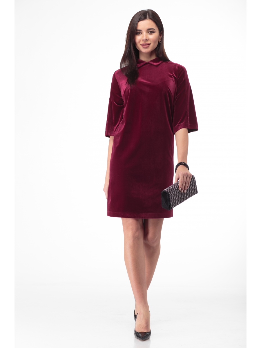 Платье прямого силуэта, длиной выше колена. На передних частях выполнены нагрудные вытачки. Спинка со средним швом, и потайной застежкой молнией в нем. Рукав комбинированный, реглан, длиной 3/4. Аккуратный отложной воротник.