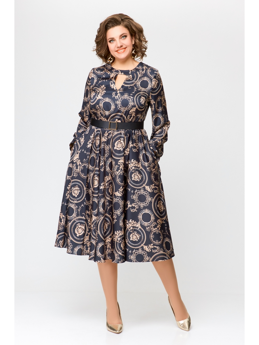 Платье из искусственного шёлка Х-образного силуэта, отрезное по линии талии. По переду лифа обработаны нагрудные вытачки, удлинённый V-образный вырез и отрезанная декоративная кокетка с застёжкой на кнопку. Спинка лифа цельнокроеная. Юбка расклешённая с карманами в боковых швах. Рукав втачной, одношовный со сборкой по шву притачивания манжеты. По низу рукава обработана манжета с завязками. По талии платье собрано на эластичную тесьму.