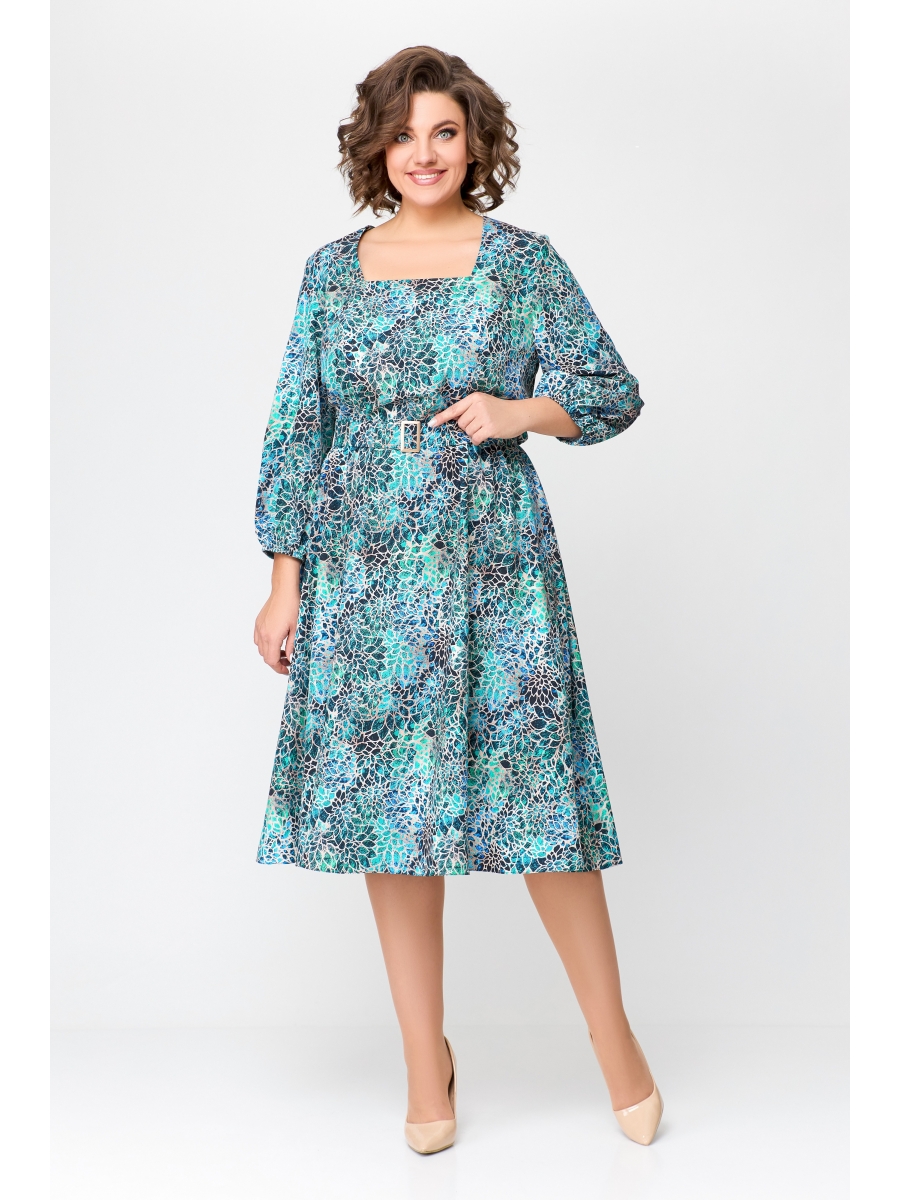 Платье Х-образного силуэта из плательной ткани. Лиф отрезной по линии талии. Передняя часть лифа с рельефами. Задняя часть лифа со средним швом и молнией длиной 35 см. Юбка расклешенная. По талии платье собрано эластичной тесьмой. Рукав втачной, одношовный, длиной ¾. По низу рукав собран эластичной тесьмой. Горловина по переду квадратной формы.