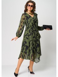 Платье женское нарядное свободного силуэта на подкладке, выполнено из шифона с принтом. Застежка доверху на петли и пуговицы, воротник на стойке рубашечного типа, рукав втачной с приточными воланами со сборкой. По спинке двойная кокетка и встречная складка по центру. Низ фигурный, в боковых швах обработаны небольшие разрезы.
