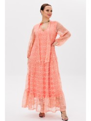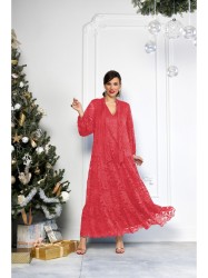 Вечернее платье макси из кружевного полотна, на подкладке, трапециевидного силуэта — дополнение любого образа. Отличный вариан на любое торжество. По горловине V-образный вырез и стойка переходящая в бант. Рукав расширенный к низу, на резинке, фигурный. По полочке и спинке идут 3 присобранных волана.