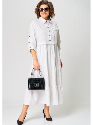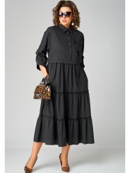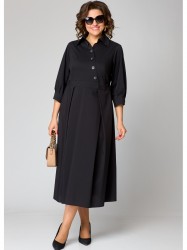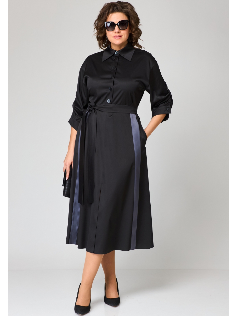 Платье женское нарядно-повседневное полуприлегающего силуэта до талии и расширенное к низу. Выполнено из плательной ткани в сочетании с отделкой. Платье отгрезное по талии. В боковых швах обработаны карманы, по переду юбки отделочные ввставки в виде вертикальных полос и центральный шов с разрезом, по спинке встречные склада. Вырез горловы воротник на стойке рубашечного типа. Застежка до талии на обментанные петли и пуговицы. Рукав втачной 7/8 по низу на притачной манжете, в рукаве отделочная пата с помощью которой можно регулировать длину рукава.