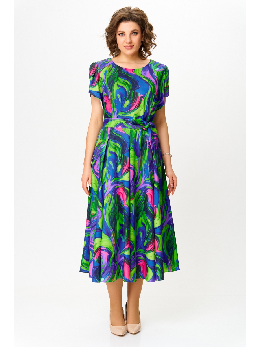 Платье из мягкой вискозной ткани Х-образного силуэта с полуприлегающим лифом. Платье отрезное по линии талии. По переду лифа расположены рельефы, по спинке лифа талиевые вытачки. Юбка расклешенная из шести клиньев со встречными складками по линии талии. В среднем шве спинки предусмотрена потайная тесьма-молния. Рукав втачной покроя тюльпан.