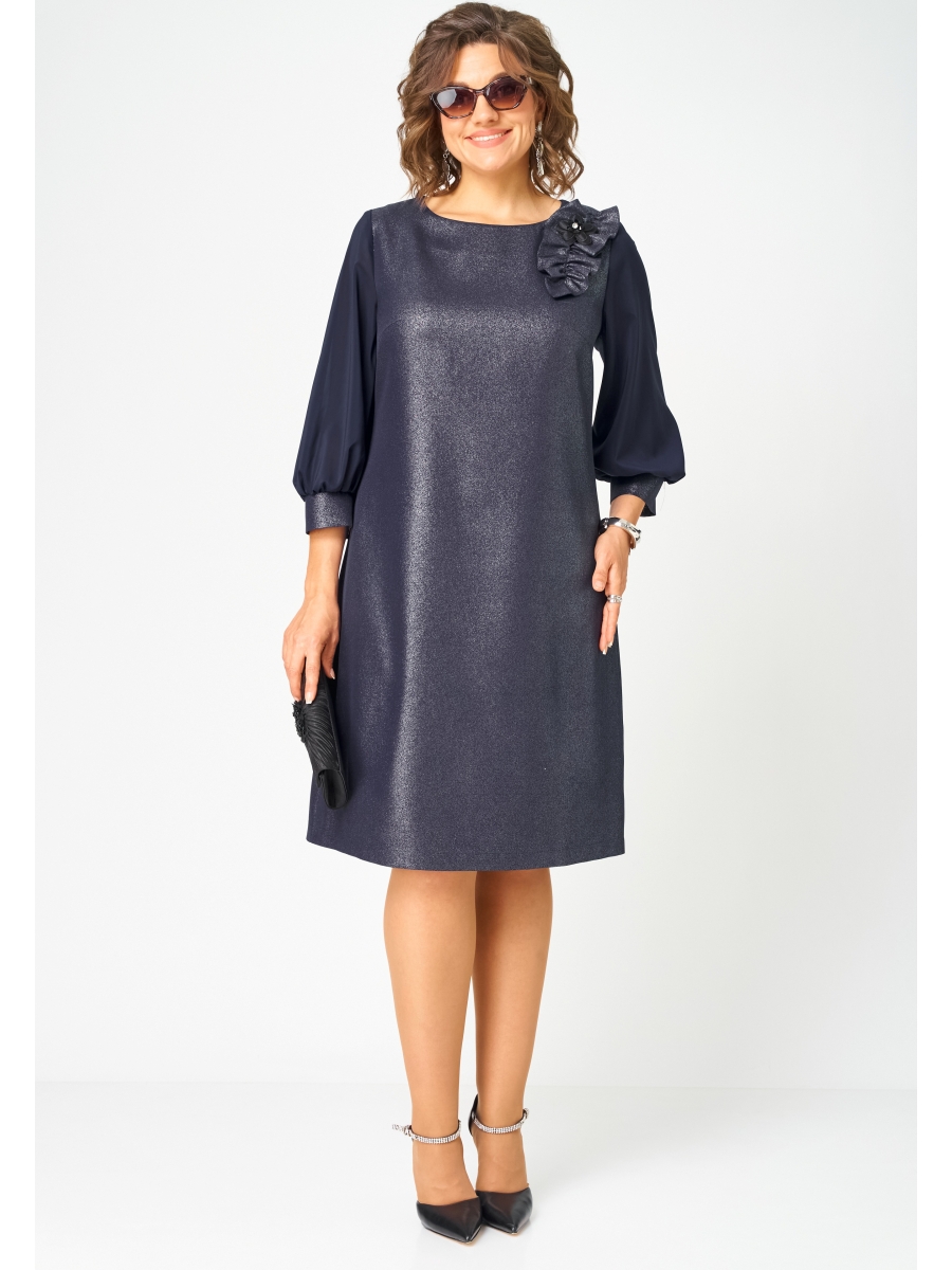 Платье женское полуприлегающего силуэта выполнено из плательной ткани с мерцающим пропитанным блеском (не сыпется) в сочетании с шифоном. Вырез горловины круглый на обтачке, по полочке нагрудные втачки, рукав втачной из шифона 7/8 по низу на сборке и притачной манжете. По спинке потайная тесьма - молния и вытачки.