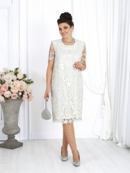 Платье женское, полуприлегающего силуэта, выполнено из гипюра и плательной ткани «сатин». Перед и спинка состоят из двух разных по длине слоев: нижний короче верхнего на 5 см. Модель без подкладки, с плечевыми накладками. Низ платья и рукавов оформлен фестонами. Перед в верхнем и нижнем слоях с нагрудными вытачками, выходящими из пройм. Спинка с талиевыми вытачками и средним швом, в верхней части которого обработана застежка на потайную тесьму-«молнию» (50см), в нижней – разрез. Вырез горловины переда и спинки округлый, углубленный по переду. Рукав короткий, втачной. Верхний и нижний слои платья скреплены по среднему шву, плечевым и проймам. Длина платья (верхний слой)-108 см, длина рукава-26 см.