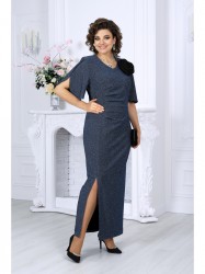 Платье женское полуприлегающего силуэта, выполнено из трикотажного полотна с фактурной лицевой стороной «люрекс». Модель на трикотажной подкладке, с плечевыми накладками. В левом боковом шве расположена застежка на потайную тесьму-«молнию» (35 см). Перед платья со смещенным к боковому шву рельефом, идущим от проймы до низа; в нижней части рельефа обработан разрез. Левая часть переда отрезная по линии талии, с односторонними горизонтальными складками, направленными от рельефа к центру. Спинка с талиевыми вытачками. Горловина спинки округлая, по переду V-образная, углубленная. Рукав короткий, втачной, формы «крылышко на запах», со скругленными срезами. Платье дополнено съемным «цветком» из основного полотна. Длина платья - 136 см; длина рукава - 34 см.