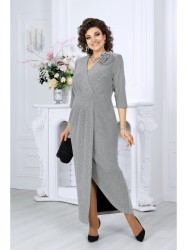 Платье женское полуприлегающего силуэта, выполнено из трикотажного полотна с фактурной лицевой стороной «люрекс». Модель на трикотажной подкладке, с плечевыми накладками. На правой части переда, вдоль отрезного пояса, заложены косые односторонние складки; детали лифа и юбки скреплены на запах. Низ платья асимметричный: правая часть переда -- удлинена к центру и оформлена углом, левая -- скругленная и входит в правый боковой шов. На спинке обработаны талиевые вытачки. В левом боковом шве предусмотрена застежка на потайную тесьму-«молнию» (35 см). Рукав длиной 3/4, втачной. Платье дополнено съемным «цветком» из основного полотна. Длина платья-138 см; длина рукава-41 см.