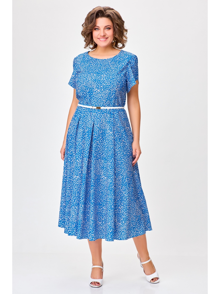 Платье женское из мягкой вискозной ткани, Х-образного силуэта с полуприлегающим лифом. Платье отрезное по линии талии. По переду лифа отрезные рельефы, по спинке талиевые выточки. Юбка расклешённая из шести клиньев со встречными складками по линии талии. В среднем шве спинки предусмотрена молния. Рукав втачной покроя тюльпан.