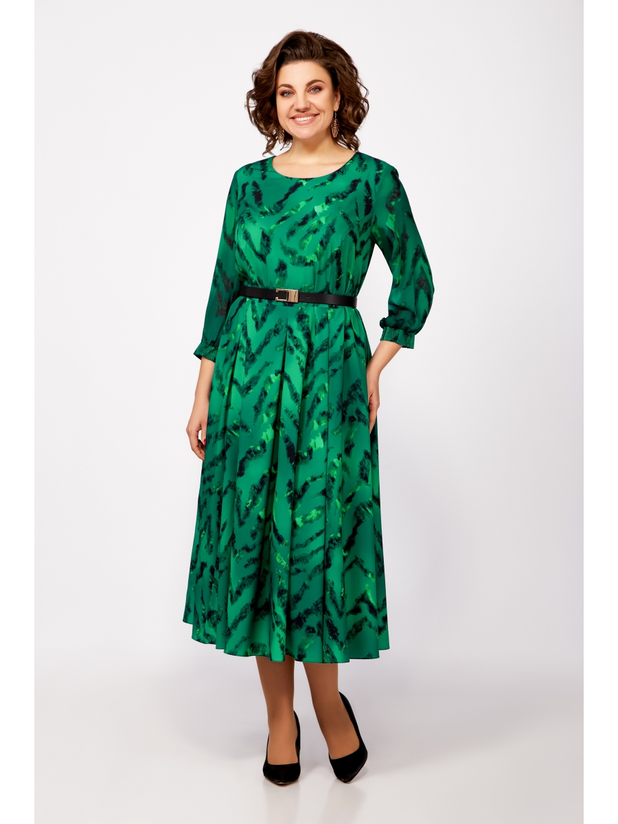 Платье из легкой плательной ткани Х-образного силуэта с полуприлегающим лифом. Платье отрезное по линии талии. По переду лифа расположены рельефы, по спинке лифа - талиевые вытачки. Юбка расклешенная из шести клиньев со встречными складками по линии талии. В среднем шве спинки предусмотрена молния. Рукав втачной. длиной ¾, выполнен из прозрачной шифоновой ткани в тон платья, по низу манжета с эластичной вставкой.