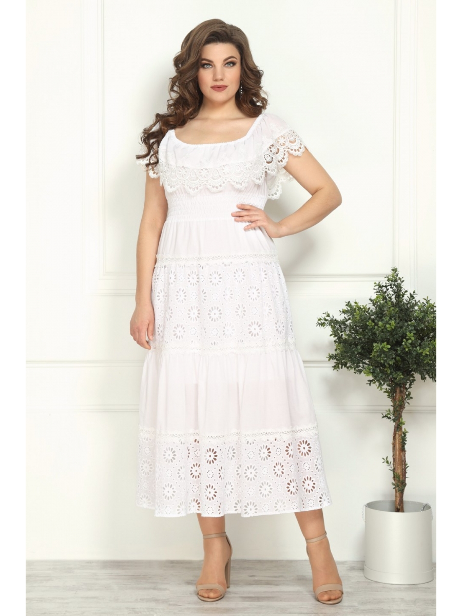 Платье женское из хлопковой ткани, отрезное по линии талии. Низ платья по переду и спинке состоит из 4-х воланов, декорированных между собой пришивным кружевом. В области талии отрезная деталь, по которой прострочена венгерка, что дает платью возможность подходить на разный тип фигуры. По лифу переда спинки перелина, которая переходит на плечи и служит одновременно рукавом. Край перелины декорирован кружевом. Из-за того что в верхний срез горловины вставлена резинка линия плеч может быть спущенной. Нижняя часть платья на подкладке из тонкого хлопка.