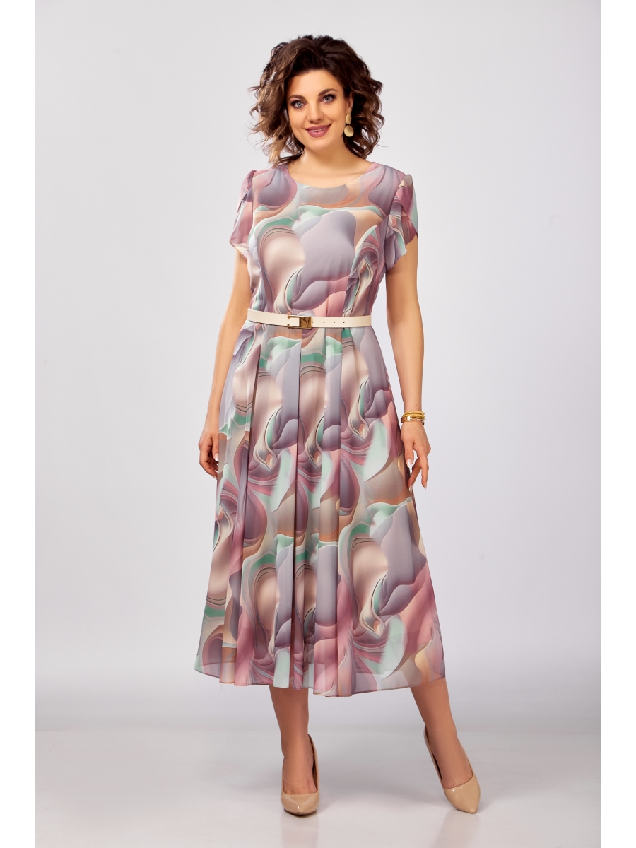 Платье из шифона на трикотажной подкладке, Х-образного силуэта с полуприлегающим лифом. Платье отрезное по линии талии. По переду лифа расположены рельефы, по спинке лифа талиевые выточки. Юбка расклешенная из шести клиньев со встречными складками по линии талии. В среднем шве спинки предусмотрена потайная тесьма - молния. Рукав втачной покроя тюльпан.