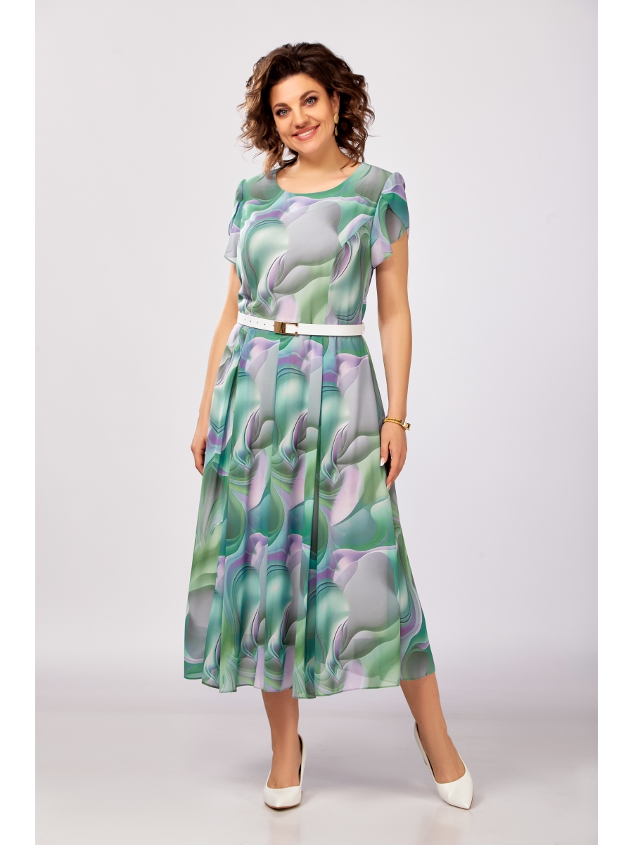 Платье из шифона на трикотажной подкладке, Х-образного силуэта с полуприлегающим лифом. Платье отрезное по линии талии. По переду лифа расположены рельефы, по спинке лифа талиевые выточки. Юбка расклешенная из шести клиньев со встречными складками по линии талии. В среднем шве спинки предусмотрена потайная тесьма- молния. Рукав втачной покроя тюльпан.