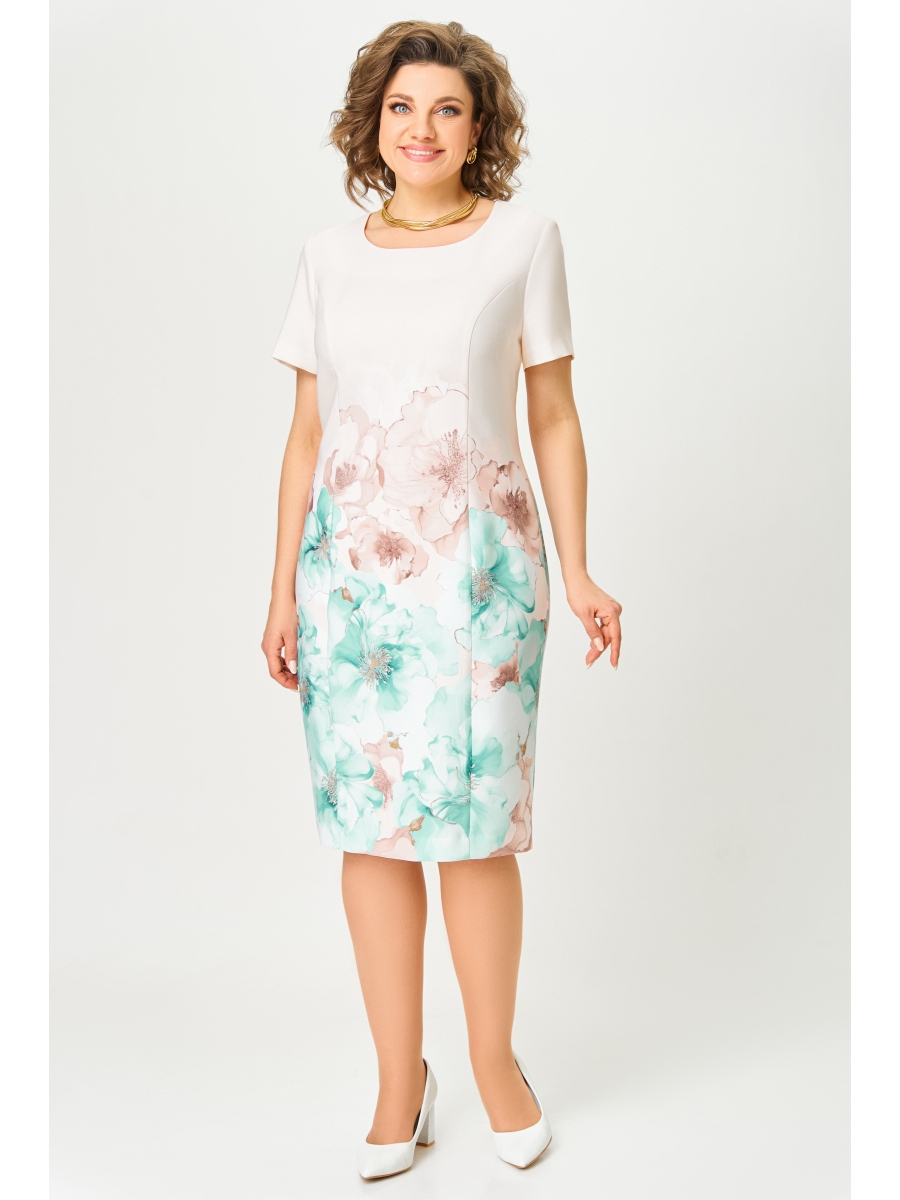 Платье полуприлегающего силуэта из мягкой поливискозной ткани с оригинальным дизайнерским принтом. По полочке выполнены рельефные швы, по спинке рельефные швы, средний шов со шлицей и застёжкой на потайную тесьму-молнию. Горловина круглая, обработана обтачкой. Рукав втачной, короткий.