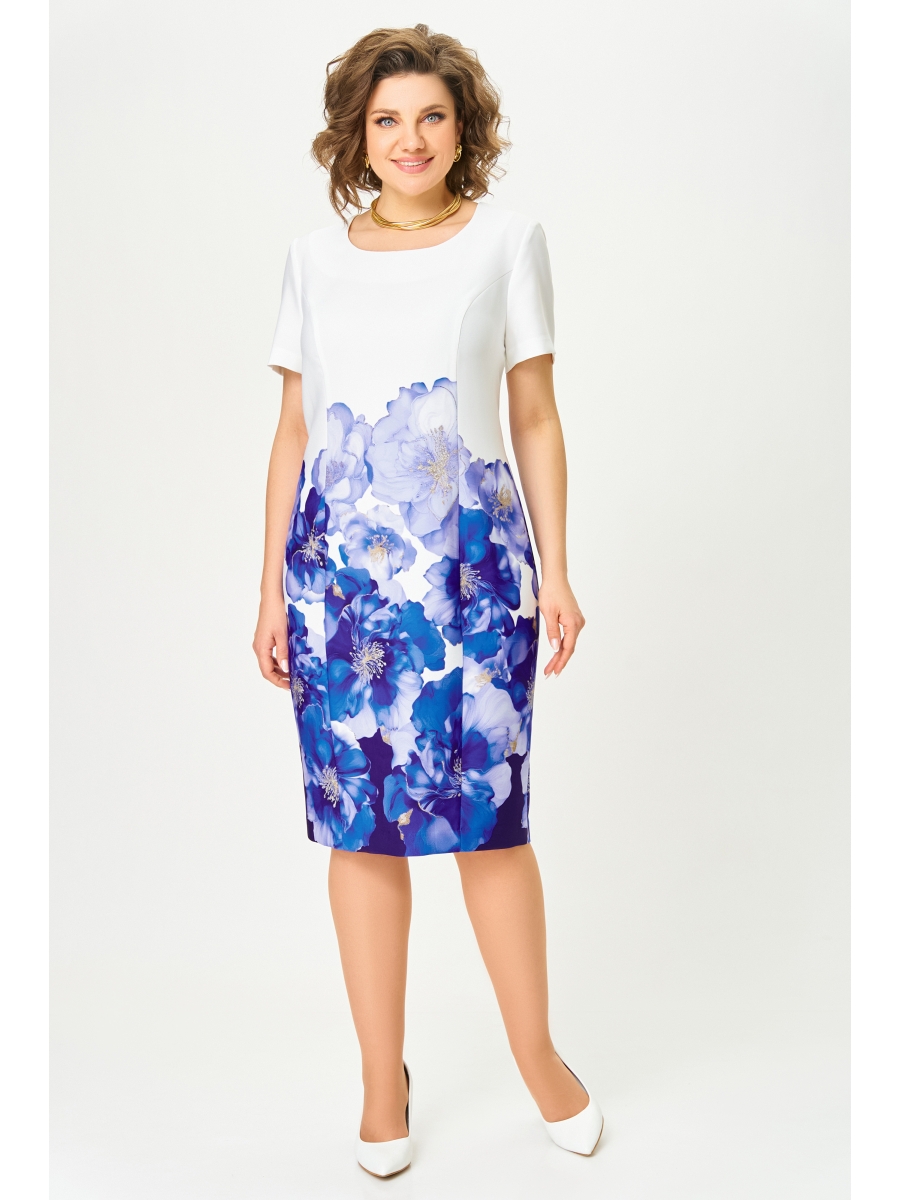 Платье полуприлегающего силуэта из мягкой поливискозной ткани с оригинальным дизайнерским принтом. По полочке выполнены рельефные швы, по спинке рельефные швы, средний шов со шлицей и застёжкой на потайную тесьму-молнию. Горловина круглая, обработана обтачкой. Рукав втачной, короткий.