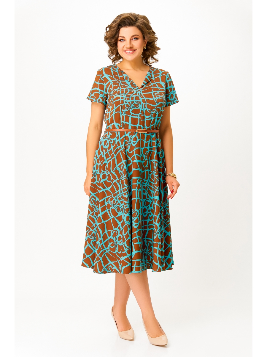 Платье из струящейся вискозной ткани, отрезное по линии талии. Лиф полуприлегающего силуэта. По полочке лифа центральный шов, нагрудные и талиевые вытачки, по спинке средний шов и талиевые вытачки. Горловина V-образной формы с отложным воротничком. Юбка расклешённая. Рукав втачной короткий, формы «тюльпан». В среднем шве спинки застёжка на потайную тесьму-молнию.