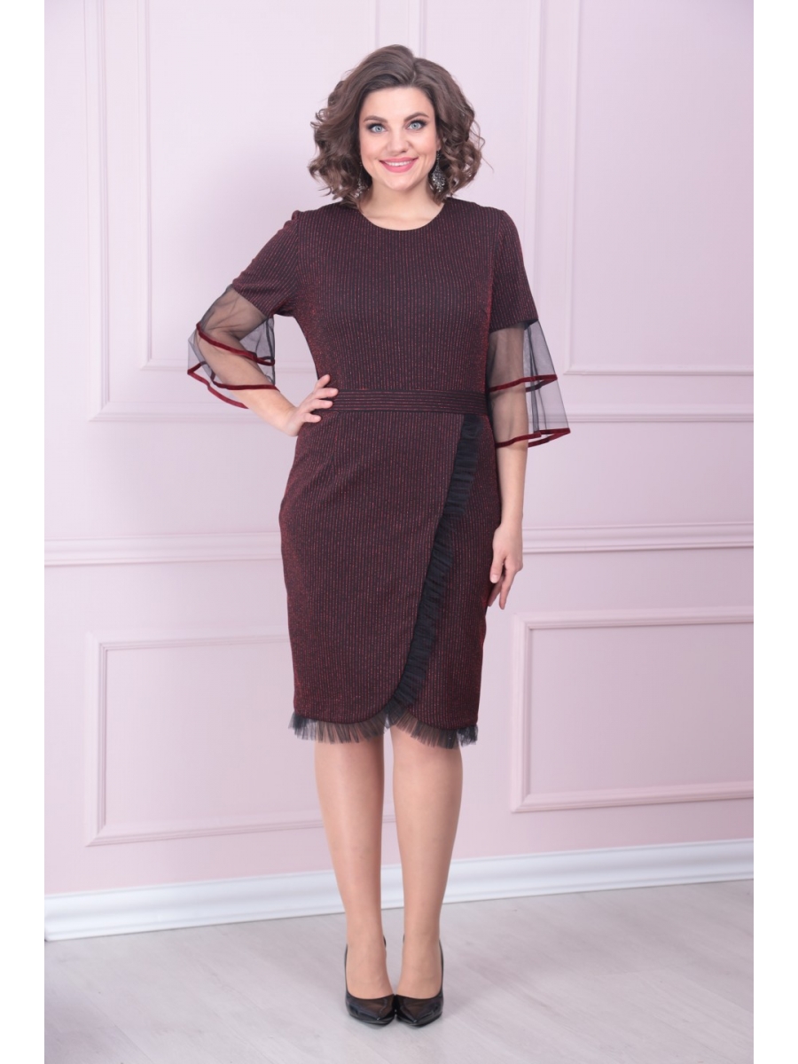 Оформить заказ →Нарядное, женское платье из приятного к телу трикотажа. По переду нагрудные выточки и отрезной пояс. Горловина округлая. Рукава втачные, заканчиваются двумя воланами из сетки, край воланов обработан настроченной бархатной тесьмой. Низ платья состоит из притачной юбки с запасом, край которой обработан рюшей. Спинка из однотонного трикотажа. Есть талевые выточки. Застежка- потайная молния по центру спинки. Низ изделия декорирован рюшей.