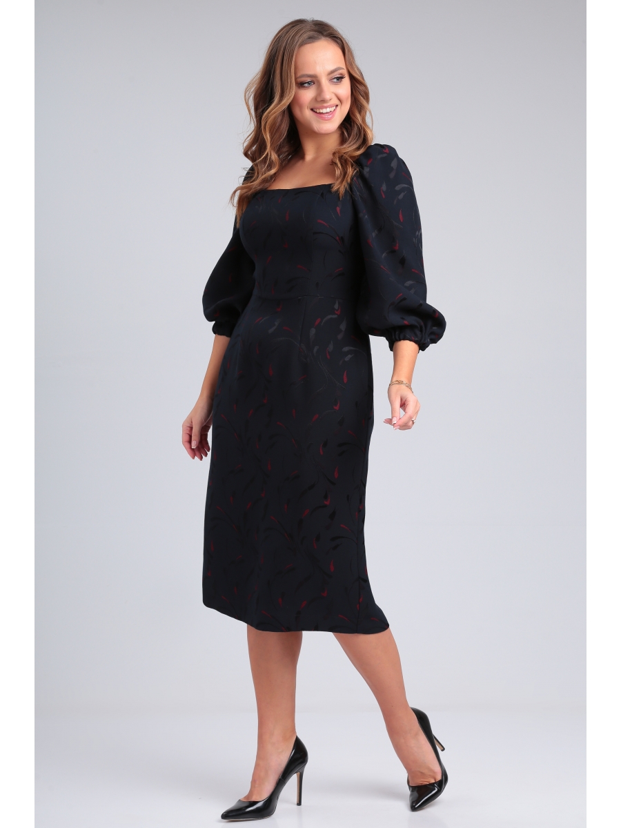 Платье из костюмно-плательной ткани приталенного силуэта длиной чуть ниже колена. Вырез горловины квадратной формы. Отрезное по линии талии. Перед и спинка с рельефами. По спинке средний шов, в котором вставлена потайная молния, внизу разрез. Рукав втачной длиной 3/4, по окату собран на резинку, в нижней части рукава сборка на резинку.