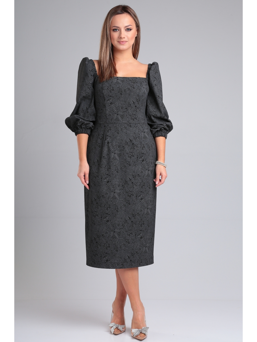 Платье из костюмно-плательной ткани приталенного силуэта длиной чуть ниже колена. Вырез горловины квадратной формы - каре. Отрезное по линии талии. Перед и спинка с рельефами. По спинке средний шов, в котором вставлена потайная молния, внизу разрез. Рукав втачной длиной 3/4, по окату собран на резинку, в нижней части рукава сборка на резинку.
