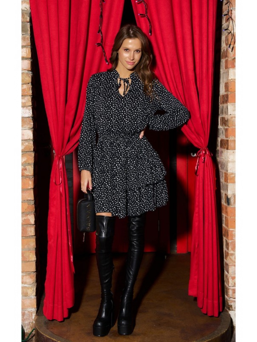 Оформить заказ →Платье женское из джинсовой ткани, отрезное по линии талии , на резинке. Из бокового шва идут грудовые выточки,спинка со средним швом. Воротник-стойка, с завязкой. Юбка с двумя воланами, рукав вточной, низ на резинке. Длина спинки: (44-54)-90 см. Длина рукава: (44-54)-59см.