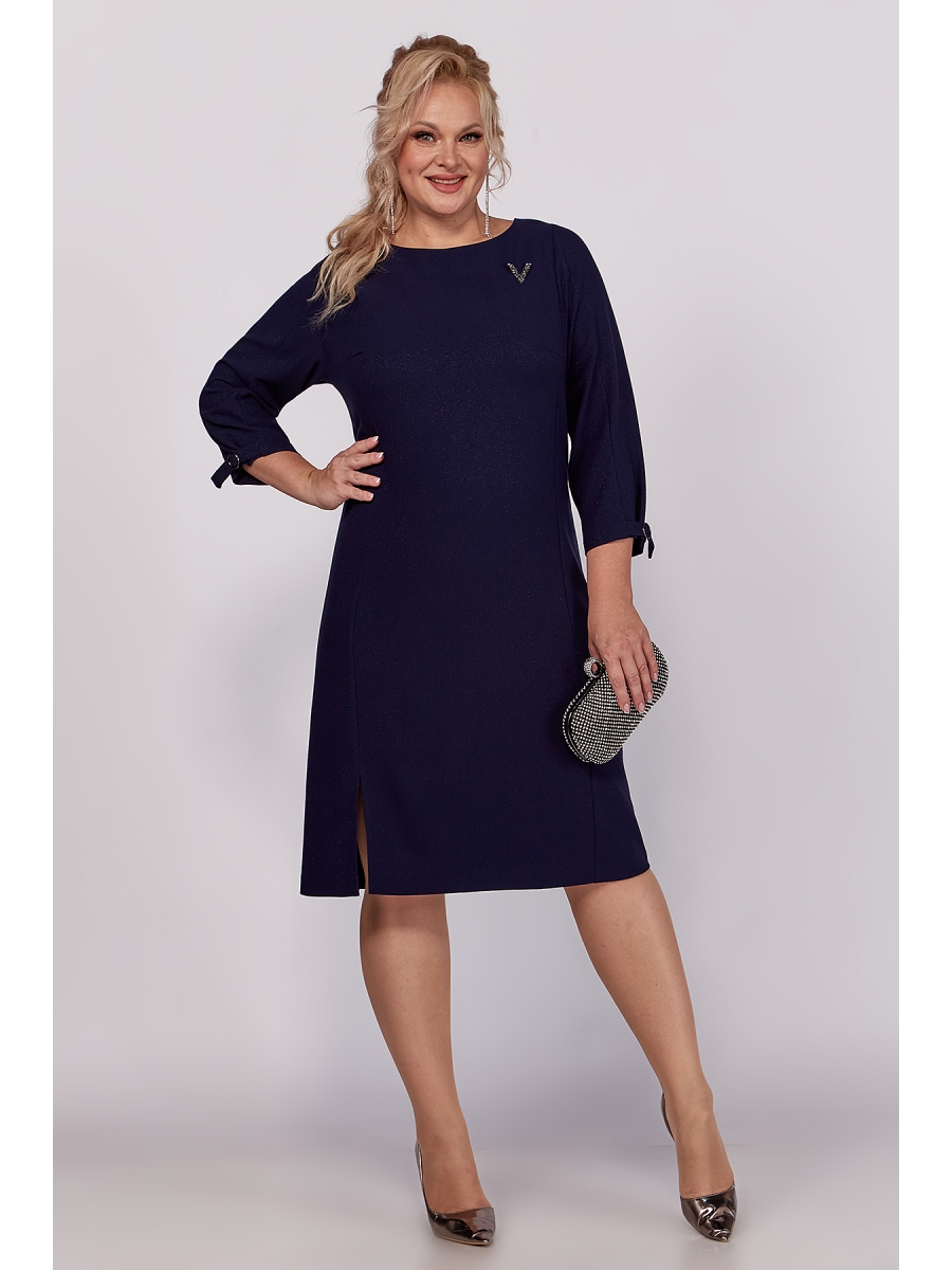 Красивое, нарядное, полуприлегающее, но в то же время не обтягивающее платье длины миди (чуть ниже колена). Элегантное платье из костюмной ткани покажет Вас как целеустремленную и активную натуру с прекрасным чувством стиля. Платье больших размеров из костюмной ткани с небольшим блеском смотрится эффектно и стильно. Сбалансированные линии создают неповторимое ощущение легкости и комфорта. Перед с рельефными швами и разрезом по низу. Рельефы и фигурная кокетка на молнии по спинке создают прилегание. Рукава втачные, одношовные, длиной 3/4. Ширина внизу рукава регулируется патой. Дополнительное прилегание создают нагрудные вытачки, направленные из рельефных швов переда. Эта модель, несомненно, подчеркнет Вашу красоту. В комплекте к платью идет брошь. Платье подойдет для любого мероприятия: будь то линейка у детей или день рождения подруги, корпоратив или свадьба – Вы будете неотразимой! По переду, в районе правого колена, обработан разрез. Такое шикарное, молодежное, деловое и классическое платье должно быть в каждом гардеробе!