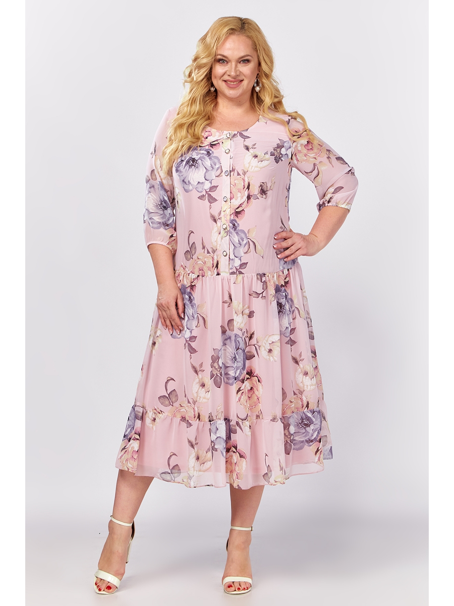 Легкое, воздушное платье из шифона на трикотажной подкладке для женщин подарит ощущение летнего бриза даже в самый знойный день. Этот элегантный наряд обязательно привлечет внимание окружающих! Нежный дизайн ткани добавляет шарм и делает его по-настоящему женственным. Крой А-силуэт нарядного изделия подходит как для повседневного образа, так и для особых случаев. Силуэт модели выделяет женственность фигуры и делает образ стильным. Платье создано для тех, кто предпочитает удобство и стиль в одном флаконе. Миди-длина платья и воланы подчеркнут грацию фигуры и добавят загадочность Вашему образу. Перед платья частично на застежке на петли и пуговицы. Рукав втачной, 3/4, по низу на резинке. Выбрав эту модель, Вы точно будете выглядеть неповторимо на любых мероприятиях!