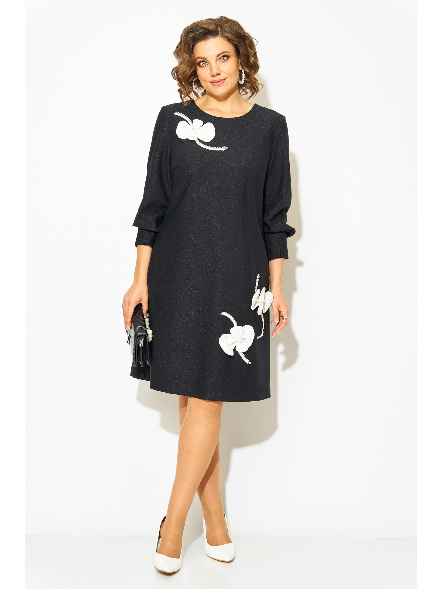 Нарядное черное платье А-силуэта – визуально вытягивает фигуру, не подчеркивая талию и придает изящность. Материал средней плотности из костюмно-плательной ткани с мерцающим эффектом. Вырез горловины округлый, в боковых швах предусмотрены карманы. Рукав вточной, с заложенными складками-за щипами по низу. Спинка с декоративным вырезом и застежкой на петлю и пуговицу.