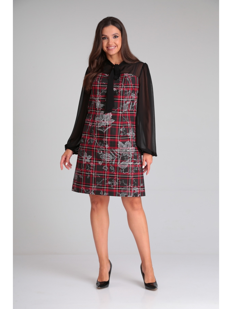 Нарядное женское платье А-образного силуэта, выполненное из двух видов ткани с имитацией сарафана с блузой. Верхняя часть платья из шифона (не тянется), нижняя часть из костюмно-плательной ткани (не тянется) в клетку с имитацией вышивки. По переду отрезная кокетка, рельефные швы, переходящие в вытачки. По спинке отрезная кокетка, средний шов и талиевые вытачки. Горловина округлая с капелькой, оформленная стойкой, переходящей в завязки - «Бант». Рукава втачные, одношовные, по низу собранные на резинку. В левом боковом шве потайная застежка-молния.