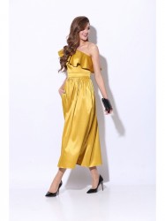 Нарядное платье из плательной ткани, отрезное по линии талии с расширенным к низу силуэтом. Лиф платья асимметричного кроя - на одно плечо, край которого обработан воланом. По талии заложены мелкие складки. Застежка на потайную молнию 23 см. на боковом шве. В комплекте предлагается съемный пояс с застежкой на пришивную кнопку. Длина изделия от плеча до талии - 39,5 см. Длина изделия от талии до низа - 90,5 см
