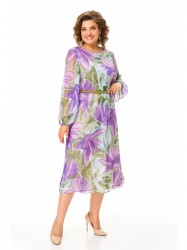 Платье выполнено из шифона с цветочным принтом. Силуэт прямой, чуть расширен к низу. По переду в горловину входит складка, складка частично настрочена. По переду есть нагрудные вытачки. Перед и спинка на трикотажной подкладке. Рукав втачной, прямой, к низу расширен. Низ рукава на резиночке. Спинка со средним швом, без особенностей.
