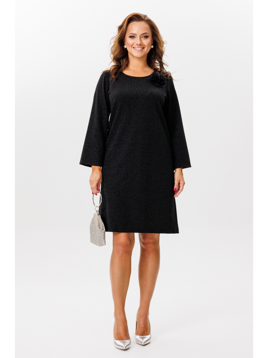 Нарядное платье, выполненное из крепа на трикотажной основе с тоненькой нитью люреска (тянется). Платье А-силуэта. Спинка со средним швом. Горловина округлой формы, обработана окантовкой. Рукава втачные, одношовные, расширенные к низу. Платье декорировано съемным цветком на булавке (цветок может отличаться от фото). Платье без подкладки.