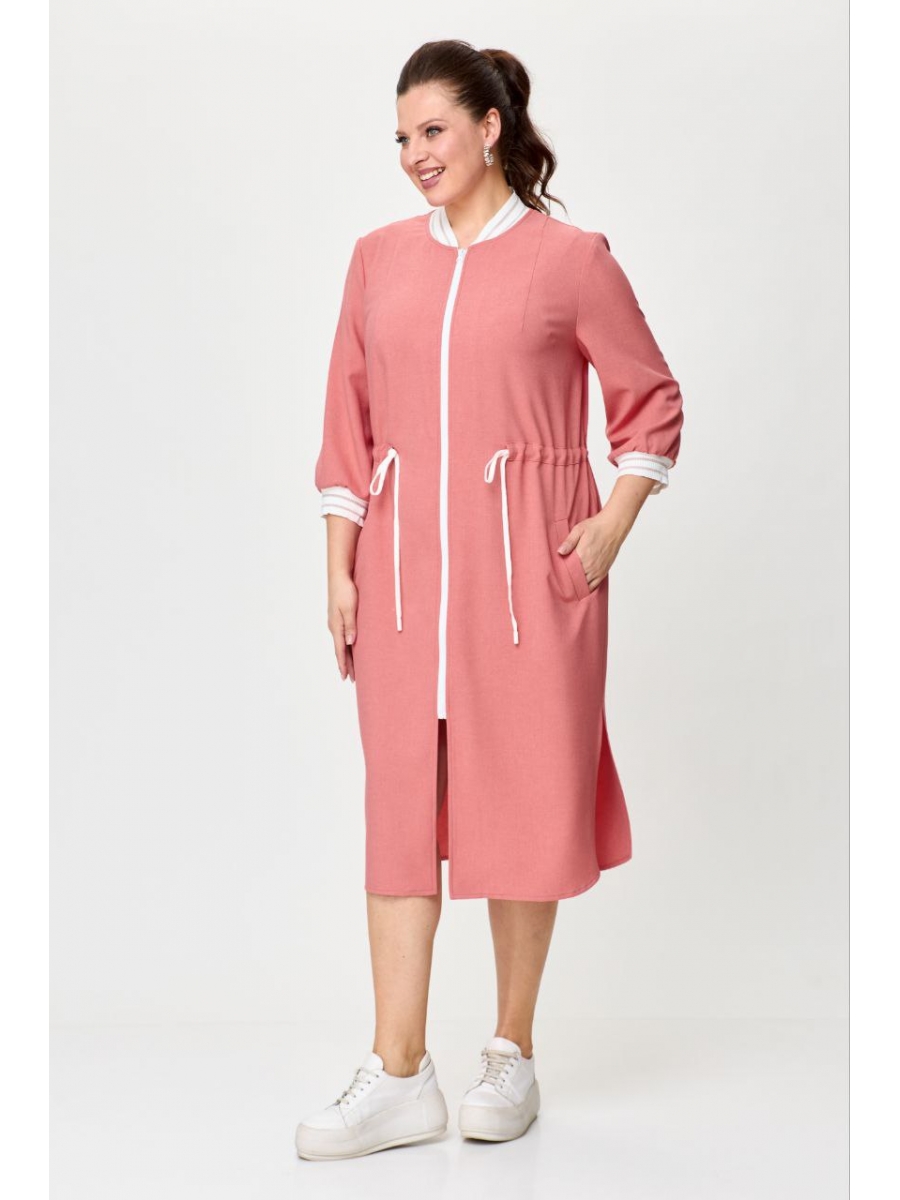 Платье полуприлегающего силуэта, прилегание за счет кулиски по талии. На деталях переда обработаны прорезные карманы с листочкой. Застежка на тесьму-молнию. Горловина круглой формы, воротник-стойка из довяза. Рукав длиной 7/8 с декоративным манжетом и довяза. По боковым швам разрезы. Длина платья по спинке – 113 см (±3 см). Длина рукава - 48 см. Рост модели на фото 170 см