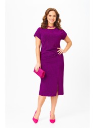 Нарядное женское платье полуприлегающего силуэта со спущенной линией плеча, выполненное из крепа на трикотажной основе с люрексом (легкое мерцание). Полотно эластичное. По левой части переда рельефный шов, переходящий в разрез. По правой части переда в области талии – мягкие складки от рельефного шва. По спинке средний шов. Горловина округлой формы, обработана окантовкой. Платье без подкладки и без застежки.